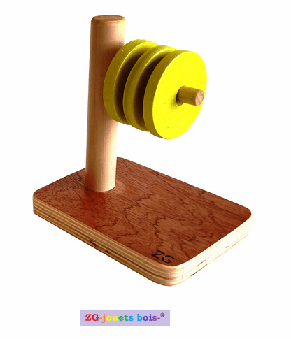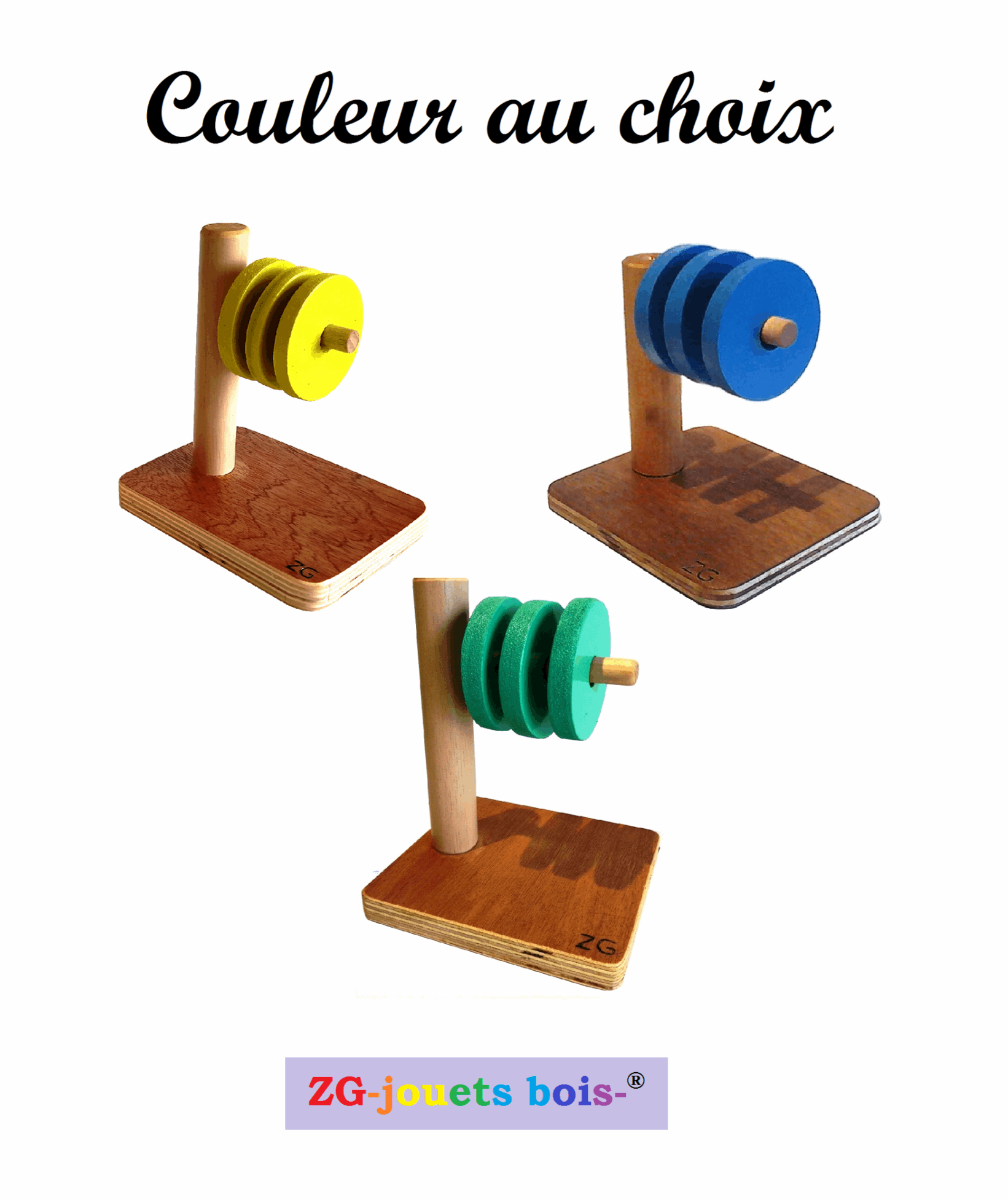 Embedded game, painted wooden pucks, horizontal rod, Montessori educational toy, same diameters, handcrafted product, customizable. Game allowing the eye/hand coordination of the child, the development of his fine motor skills and his concentration.