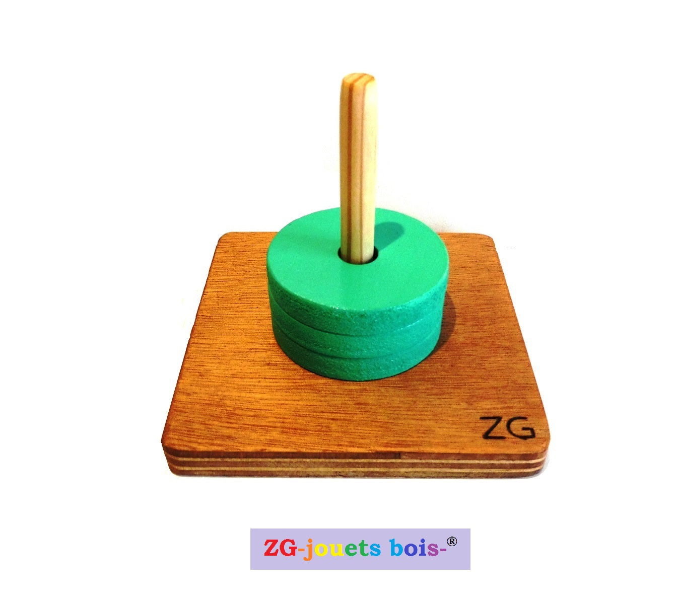 Embedded game, painted wooden pucks, vertical rod, Montessori educational toy, same diameters, handcrafted product, customizable.