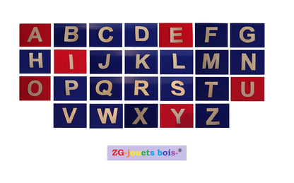 Matériel de la pédagogie Montessori pour la préparation à l'écriture par la connaissance de l'alphabet et par une discrimination visuelle, tactile et auditive.
