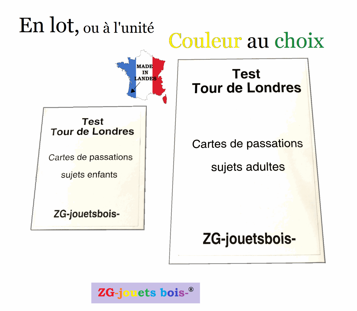 You are a professional or a student in psychomotricity, neurology or speech therapy, and have acquired the equipment to carry out the Tower of London test (Shallice 1982), you do not have time to make the examination cards by yourself, we offer you the set of passing cards for adult and child subjects: