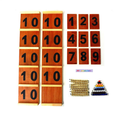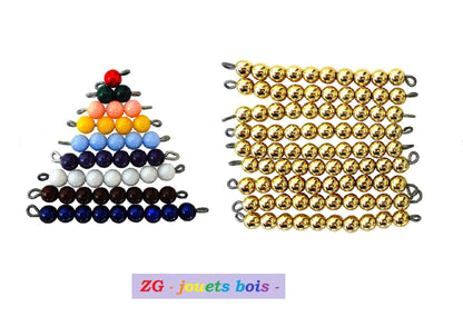 The set of Montessori beads, mounted in bars, can be supplied with (at your choice) with the possibility of having the bars of 10 in gold or orange and includes: