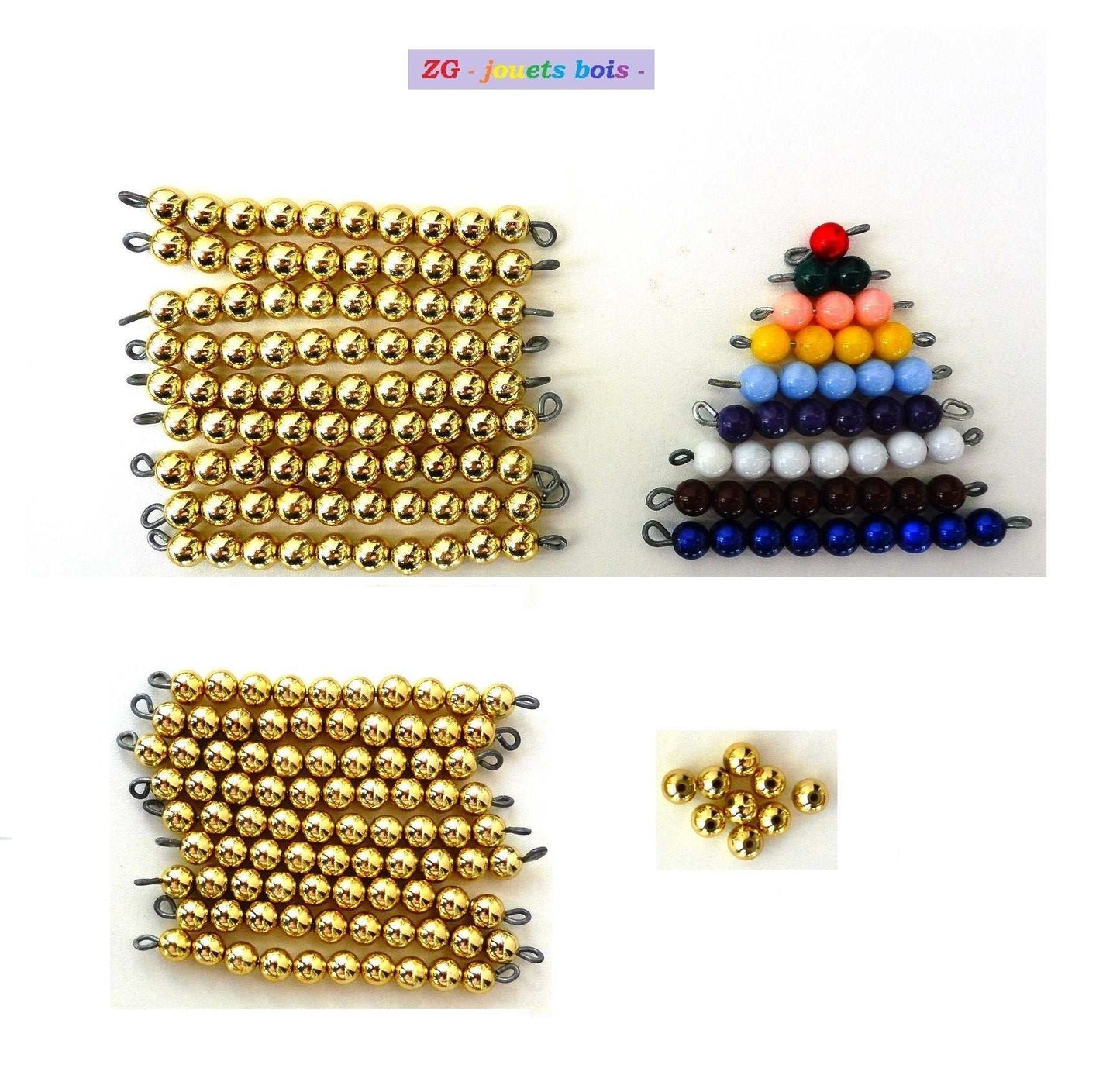 The set of Montessori beads, mounted in bars, can be supplied with (optional) with the possibility of having bars of 10 in gold or orange.