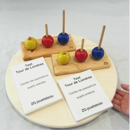 Matériel complet pour Test de la Tour de Londres. Test psychomotricité et neurologie. Empilage 3 boules peintes et vernies rouge, bleue et jaune. Cartes passations adultes et enfants. Fait main.