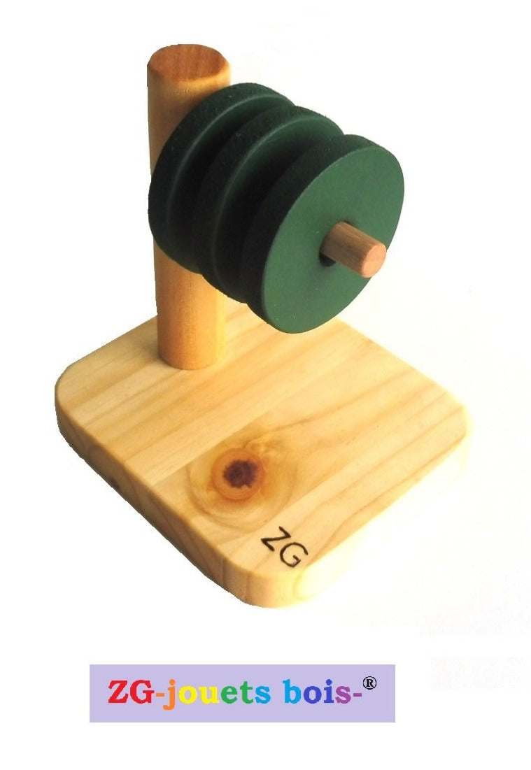 Juego de empotrar, pucks de madera pintada, barra horizontal, juguete educativo Montessori, mismos diámetros, producto artesanal, personalizable. Juego que permite la coordinación ojo/mano del niño, el desarrollo de su motricidad fina y su concentración.
