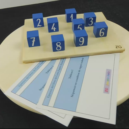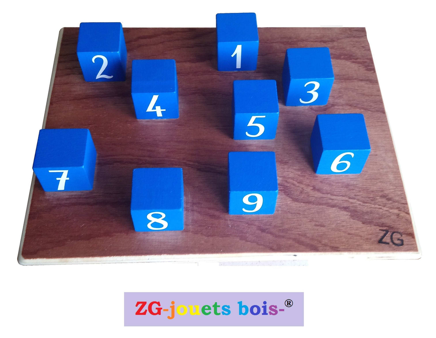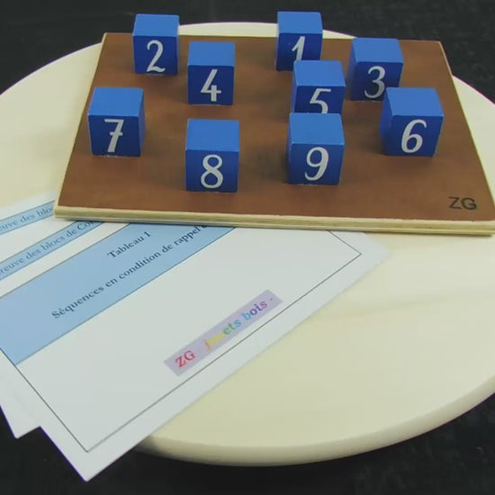 Matériel en bois composé d'une plaque en bois blanche ou marron au choix. Les neufs cubes bleus sont numérotés face visible examinateur.