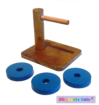 Jeu Encastrement, palets bois peints, tige horizontale, jouet éducatif Montessori, mêmes diamètres, produit artisanal, personnalisable. Jeu permettant la coordination oeil/main de l'enfant, le développement de sa motricité fine et de sa concentration.