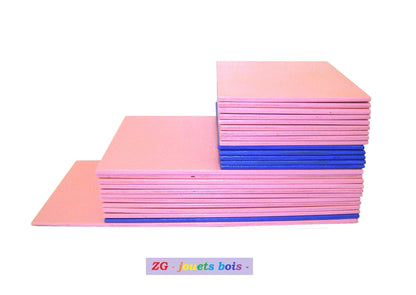 Les 26 plaques sont découpées par nos soins dans du contreplaqué de 5mm d'épaisseur pour une meilleure tenue dans le temps, peintes et vernies. La couleur des tablettes est fonction de vos besoins: rouge/bleu foncé ou rose/bleu clair, vous n'avez qu'à nous indiquer la couleur de voyelle que vous désirez. Choisissez de préférence le code couleur des lettres mobiles que vous utiliserez par la suite.