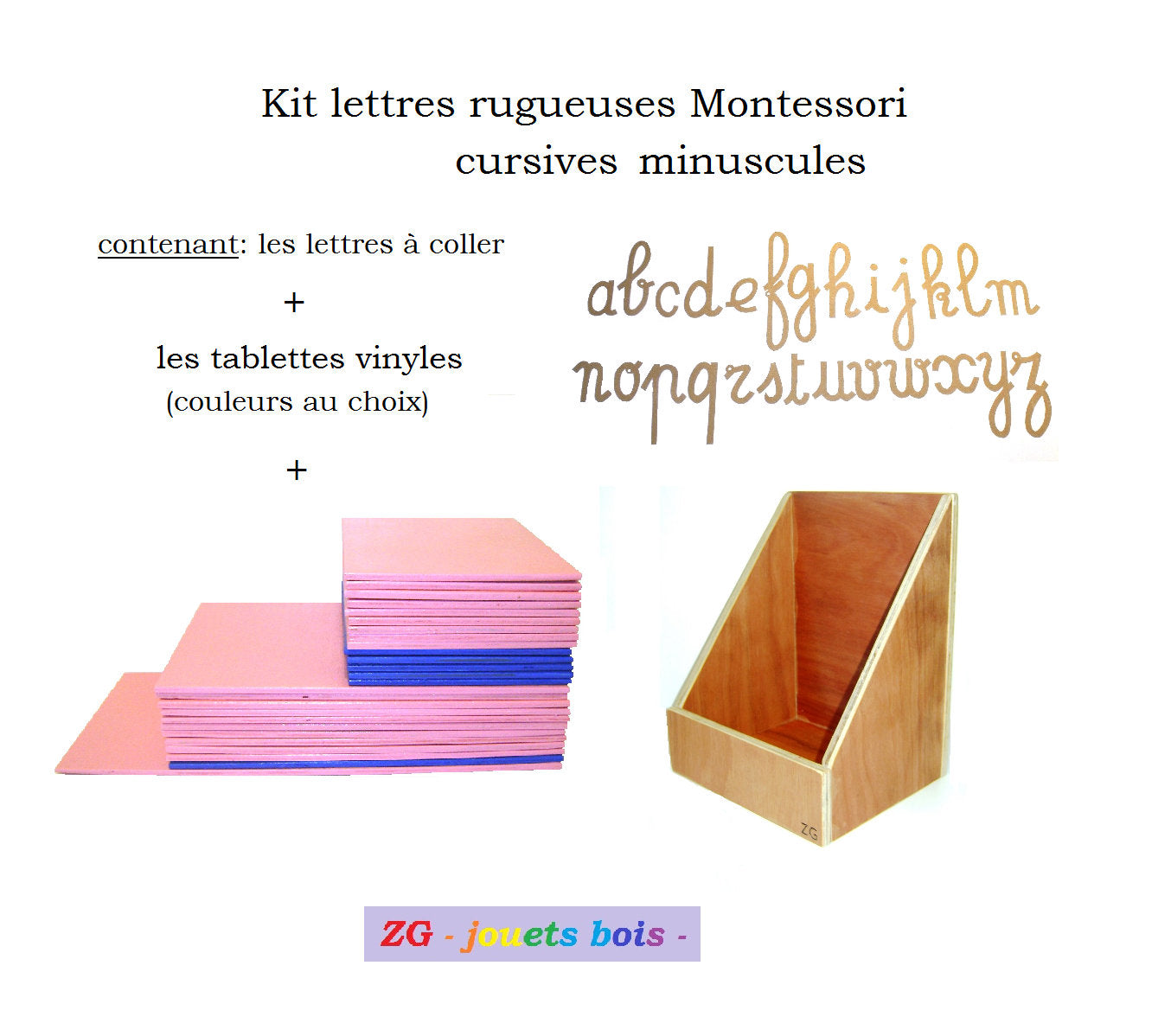 Lettres rugueuses Montessori, CURSIVES MINUSCULES, en kit ou prêt à utiliser, couleur au choix, boite de rangement, bois, fait main.