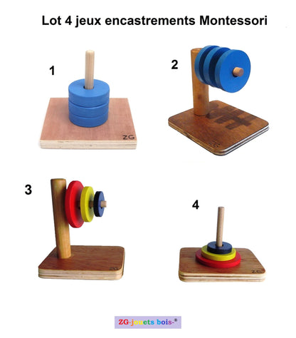 LOT 4 Jeux Encastrement, palet bois peints, jouet éducatif Montessori, difficulté évolutive, réflexion et motricité fine, produit artisanal